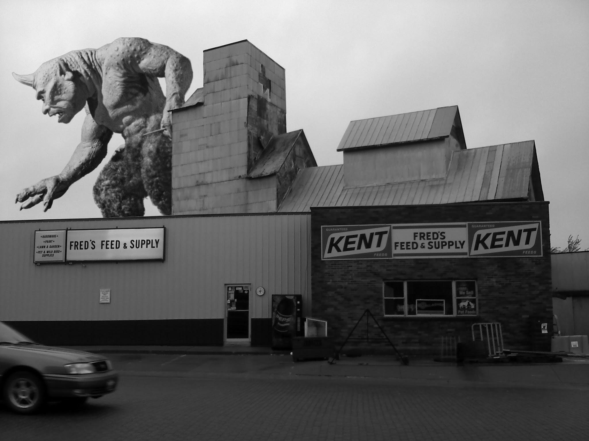 After posting the three monster-in-landscape paintings, a Reddit user who informed me he was an architecture student showed me images of his work. His scale model of a building included miniature versions of my paintings. His professor had told him to include artwork in his building. Not sure this is what he had in mind. :)